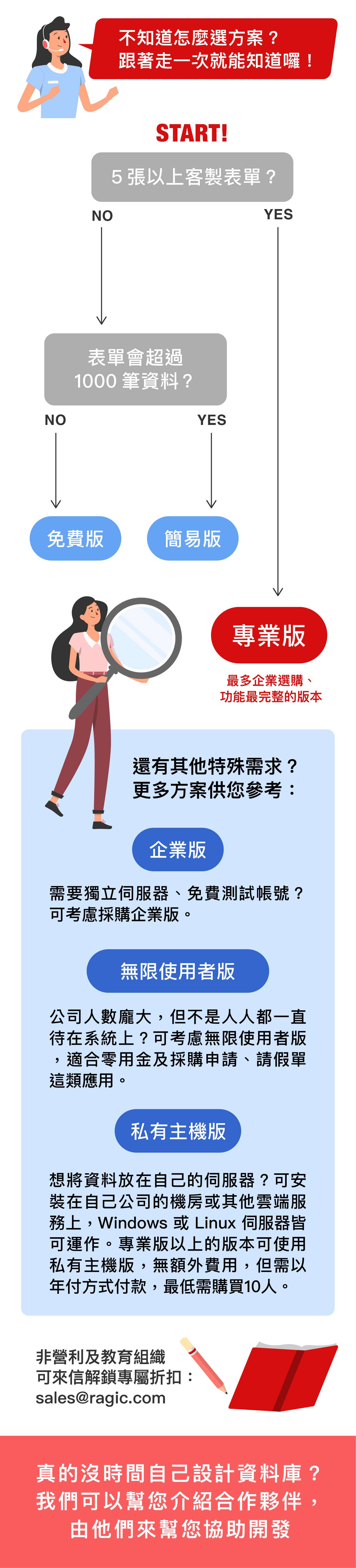 如果仍有疑虑,你也可以购买私有主机版本的授权,便可以安装在你自己的主机或自行租用的主机上。如果想瞭解更多我们的资安措施,请来信support@ragic.com
